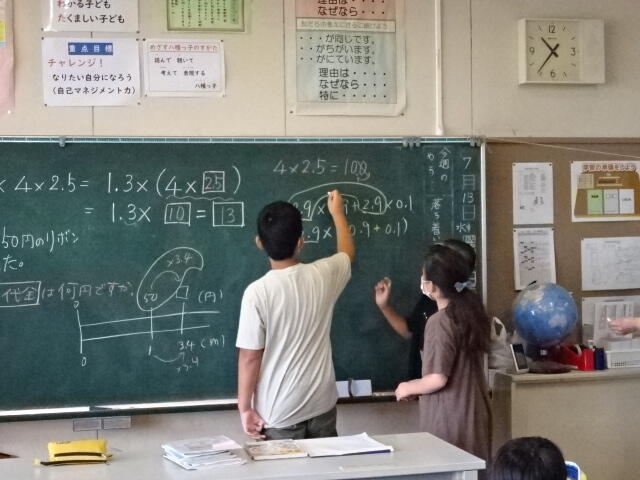 計算のきまりを使うと、簡単に計算できることを理解した5年生。