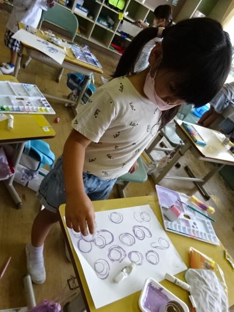 いろいろな形のものに絵の具を塗ってぺったん。