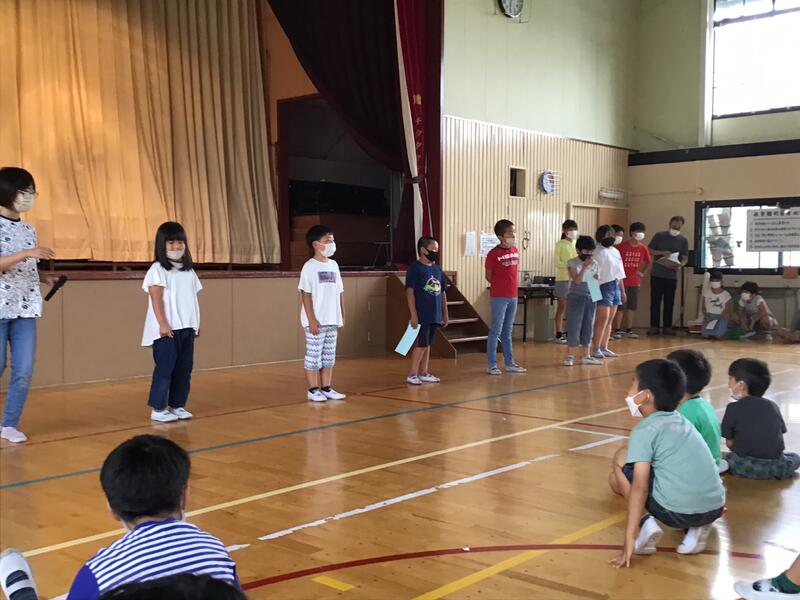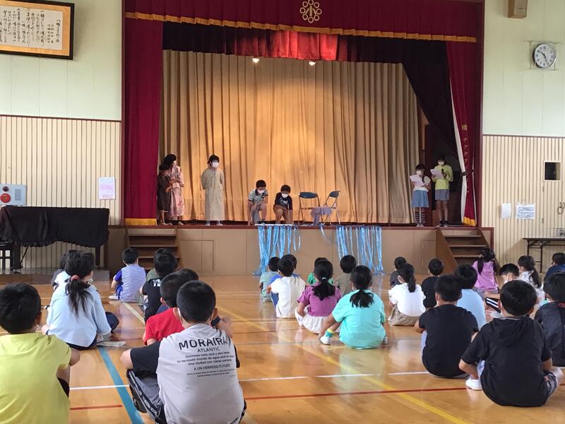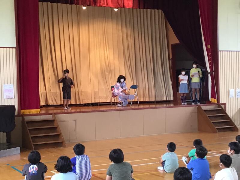 次に児童代表のことばがあり、その後に、企画委員会による七夕の劇を行いました。織り姫、彦星、天の神、牛、かささぎ、ナレーターと、それぞれの役を一生懸命演じていました。全校生も、楽しそうに見ていました。