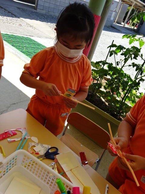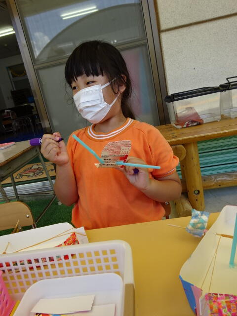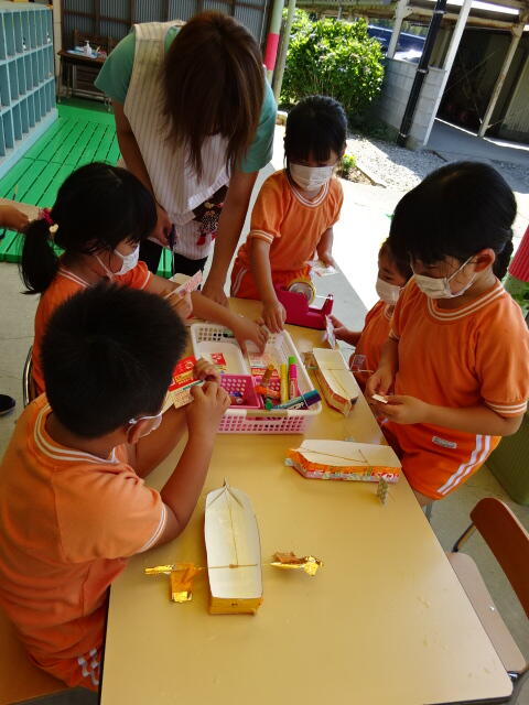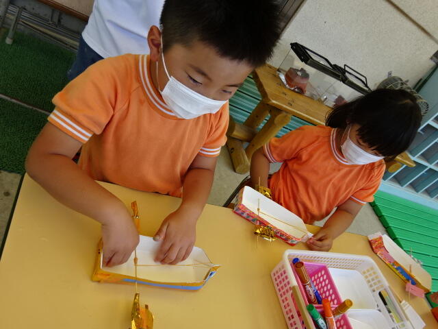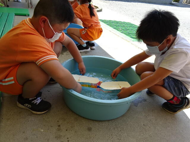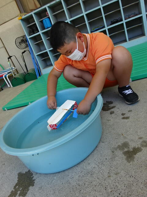 年長児がゴムで動く船を作って、水に浮かべて動かしてみました。