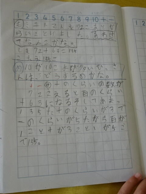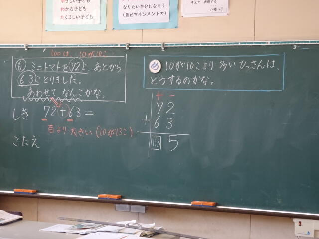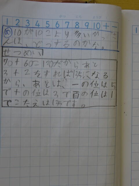 今日は、10が10こより多い筆算はどうやって計算をするのかを考えました。