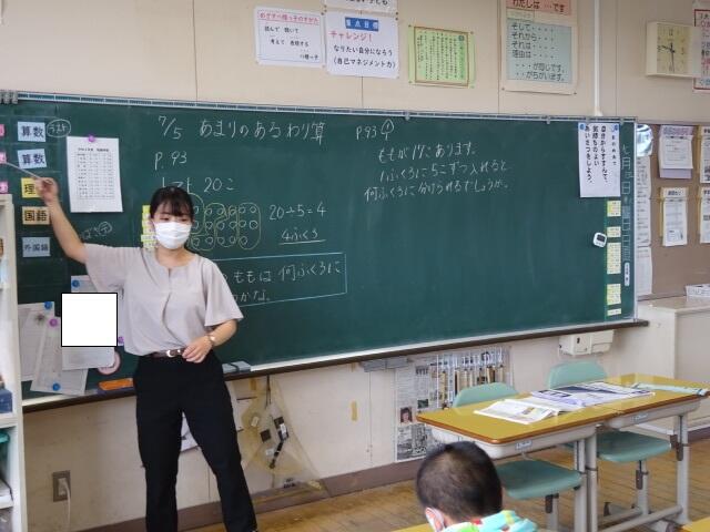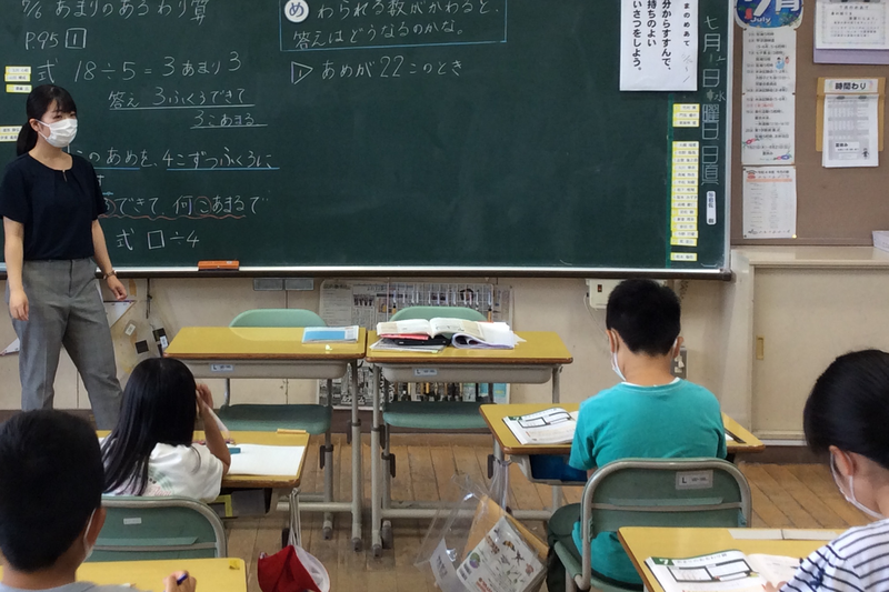 3年生の算数の授業の様子です。あまりのあるわり算の学習をしています。現在3年生は、先生が黒板にめあてを書くのと同じ速さでノートに書けるようにがんばっています。