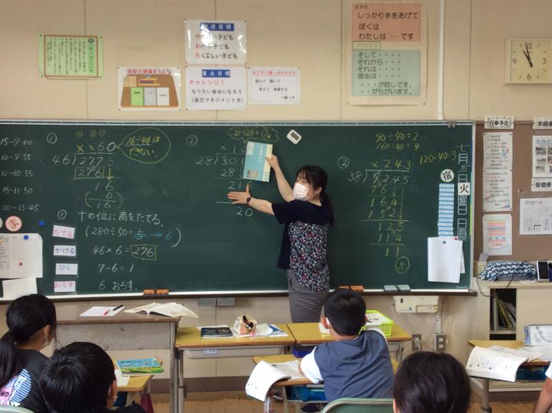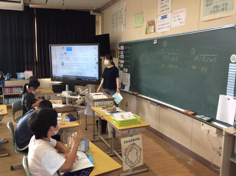 本日の4年生の算数の授業の様子です。現在、2けたの数のわり算の学習をしています。今日は、4けた÷2けたの計算のしかたを考えました。