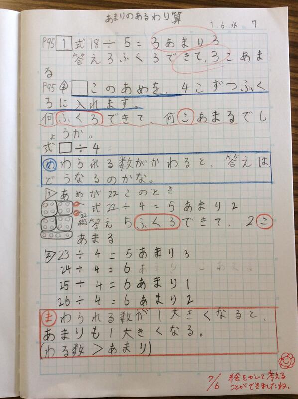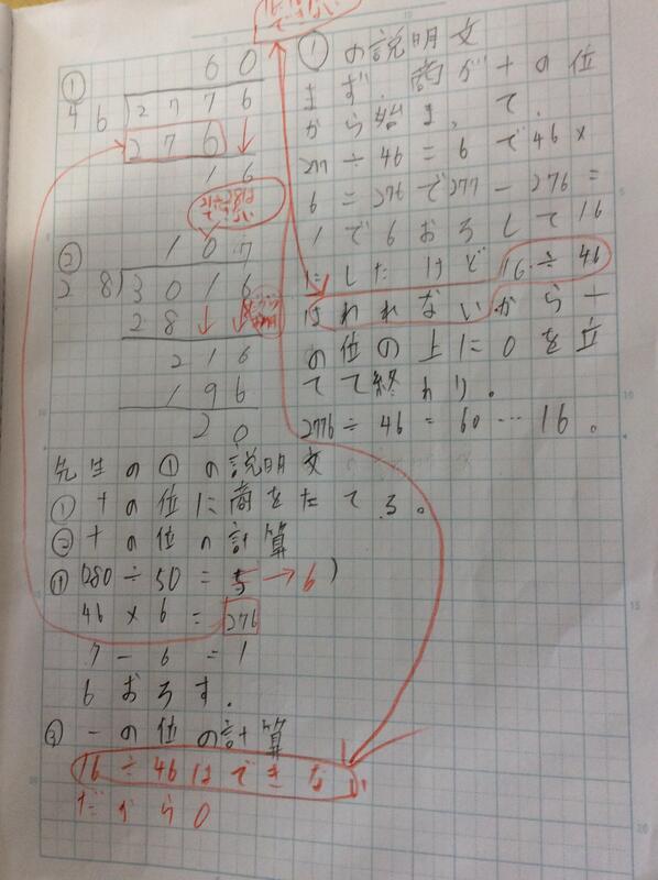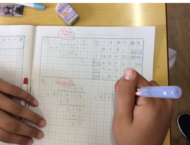 自分の考えを最初に書いて、先生の説明も書いている児童もいました。4けた÷2けたは、慣れるまで時間がかかるかもしれませんが、子でもたちは、じっくり問題に取り組んでいます。ぜひ、この姿勢を続けてほしいと思います。