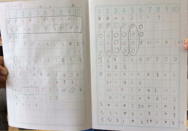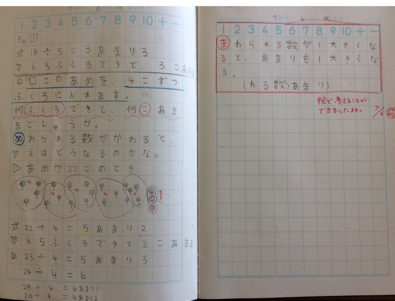 さらには、問題場面を絵に表して考えることにも挑戦しています。「ノート、上手に書けたよ。」と嬉しそうに見せてくれた子もいました。これからも、この取り組みは続きます。