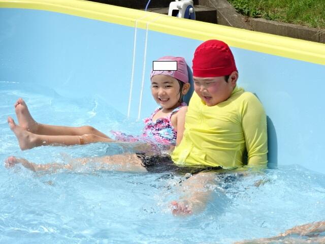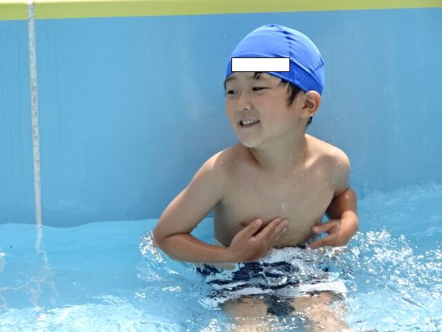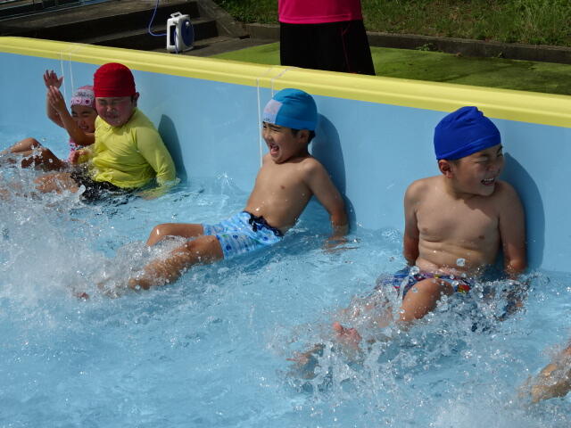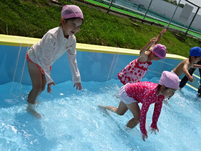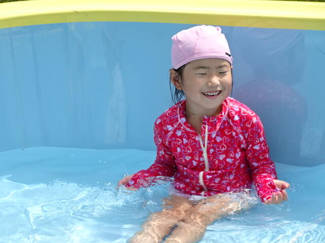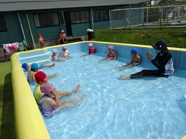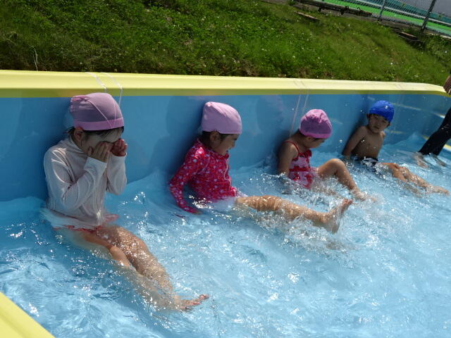 幼稚園では、水を少し入れたプールで水遊びをしました。