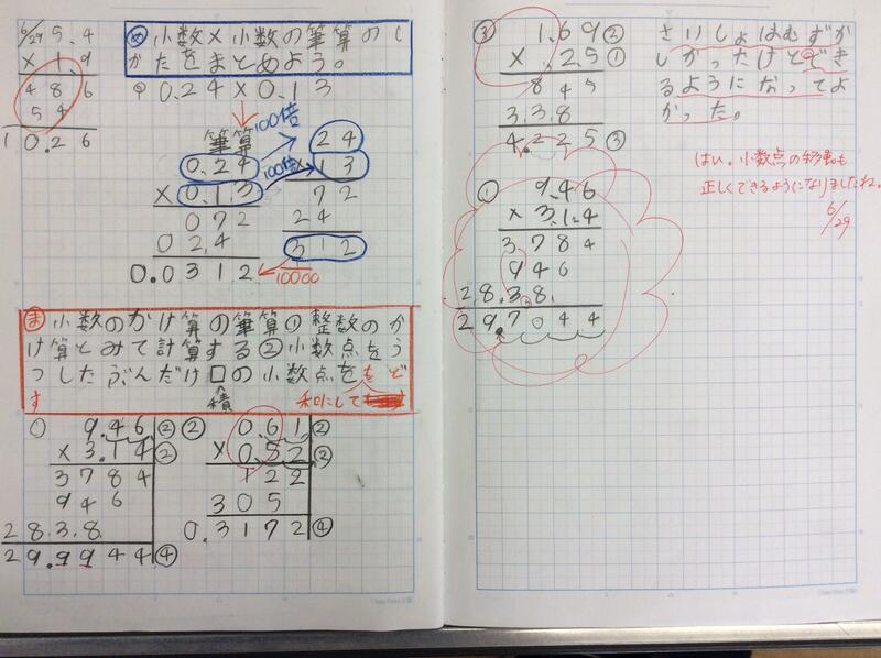 続いて、5年生のノートです。このノートのすばらしいところは、小数のかけ算の筆算のしかたを、整数のかけ算ををもとに考えて、わかりやすくまとめているところです。