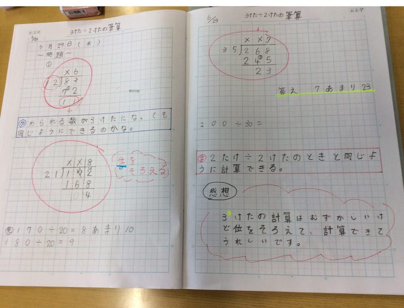 本日の算数の授業のノートです。こちらは、4年生です。このノートのすばらしいところは、板書だけ書くのではなく、自分が大切だと思うことを、吹き出しや感想として書いているところです。