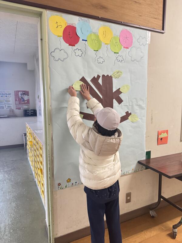 本校では、3学期から「やさしい心」「思いやりの心」で行動した児童を「思いやりの木」で紹介することにいたしました。