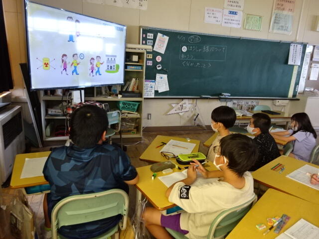 子どもたちは、映像を見ながら身近にある放射線について学習をしました。