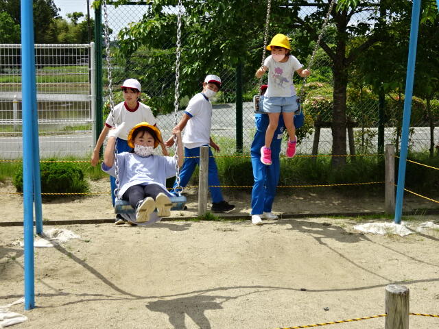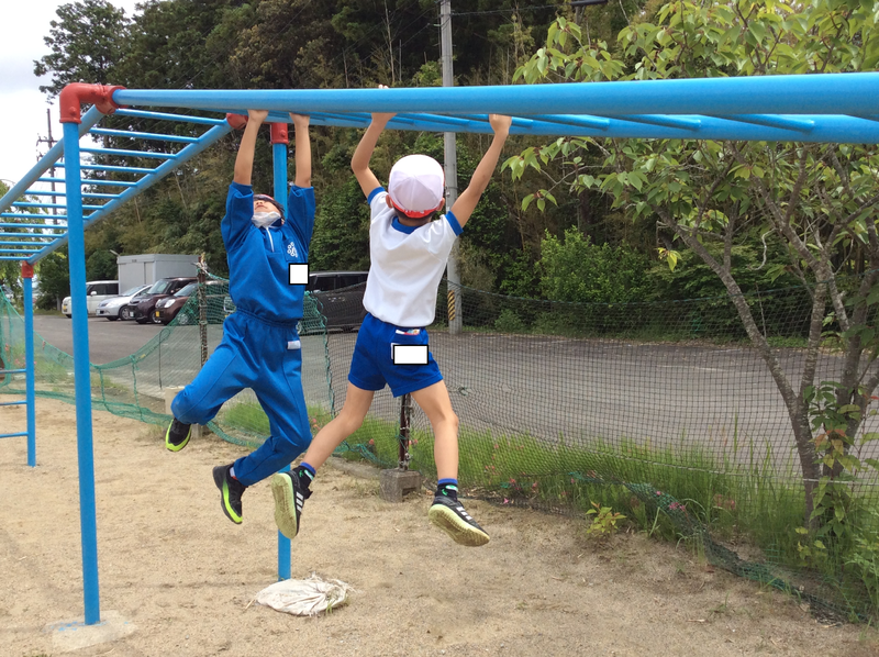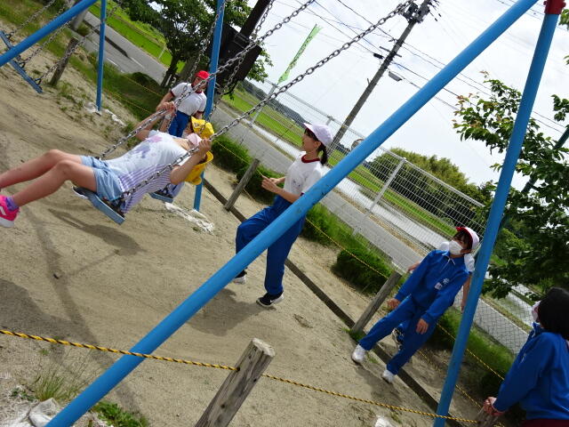 上級生に背中を押してもらってブランコを楽しむ下級生、技を磨くために鉄棒運動に挑戦する2年生、