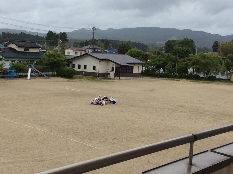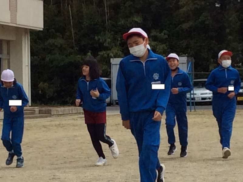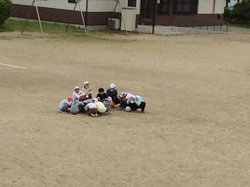 校庭にいた5年生は、校庭の真ん中に座り、頭をかくしていました。