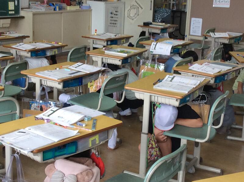 本日は、午前10時に、緊急地震速報訓練を行いました。教室で学習していた子どもたちは、すばやく机の下に体を入れて、体を守ることができました。