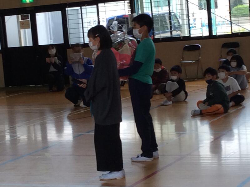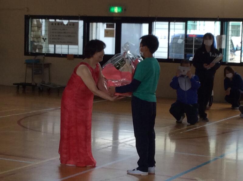 最後に児童を代表して、6年生児童がお礼の言葉を述べ、花束を渡しました。