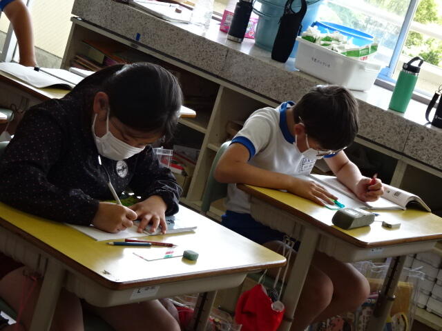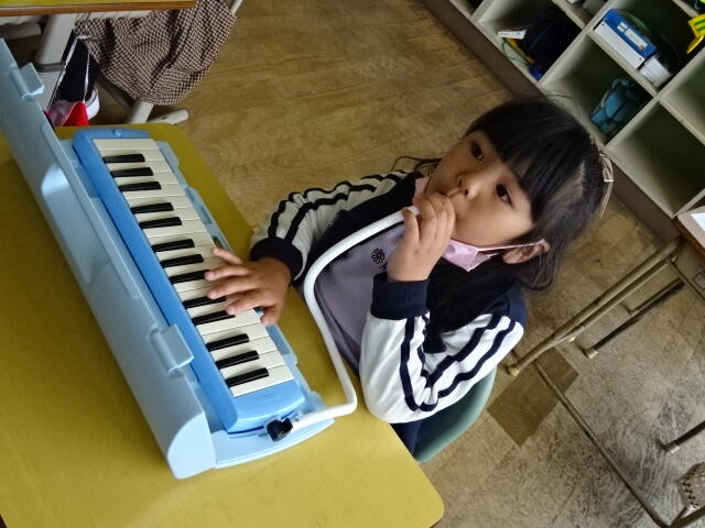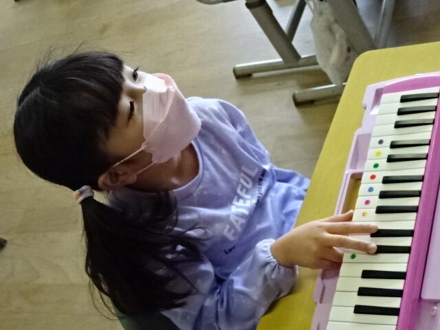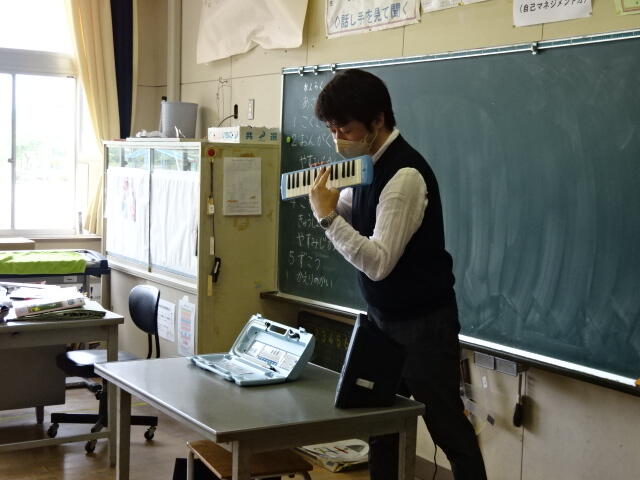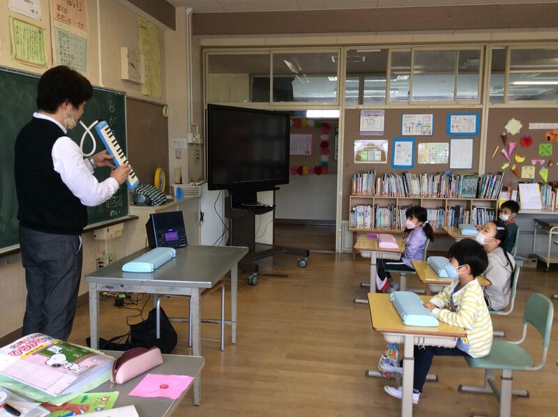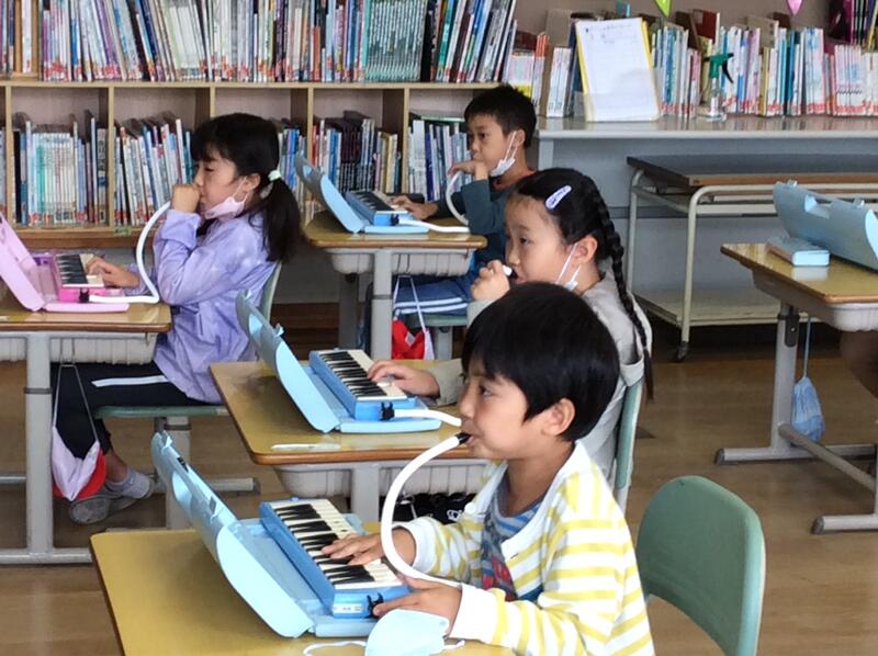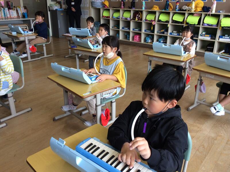 今日は、1年生が初めて鍵盤ハーモニカを使って学習をしました。初めに、講師の先生の演奏を聴いてうっとり。その後は、いよいよ自分たちの番です。