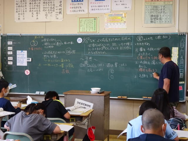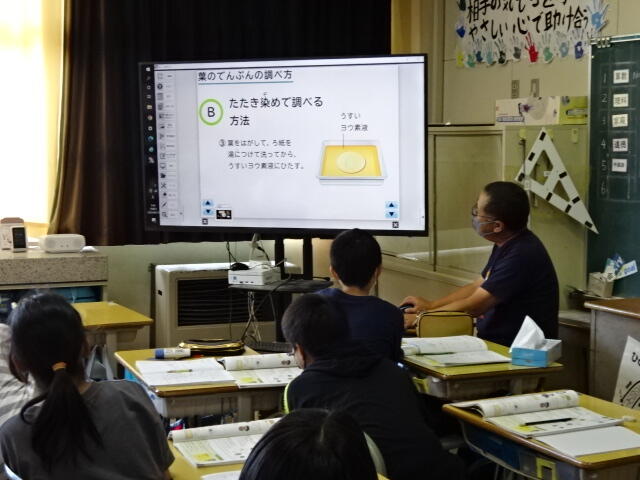日光に当たった葉にでんぷんが含まれているかどうかを調べる実験の方法を確認しました。