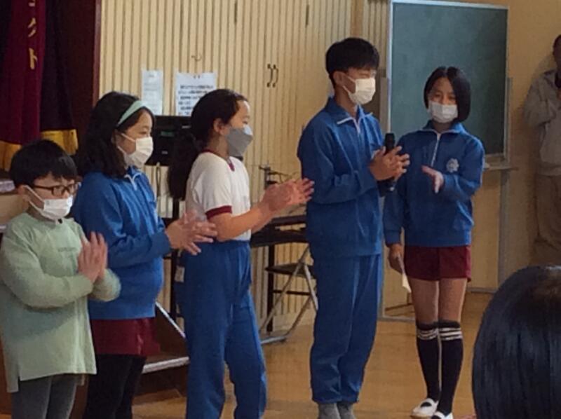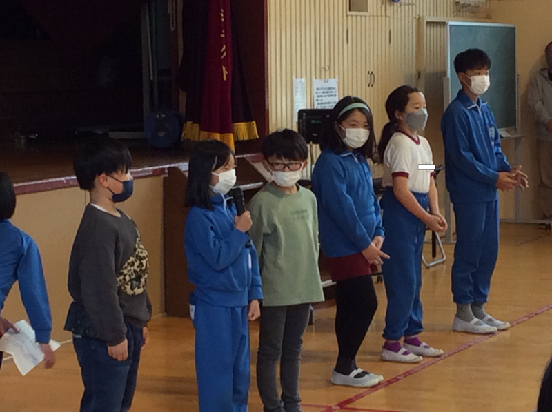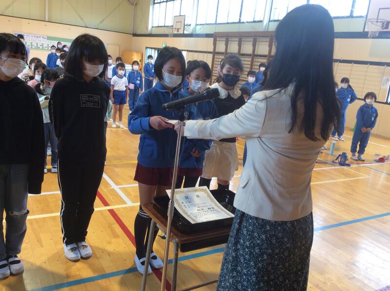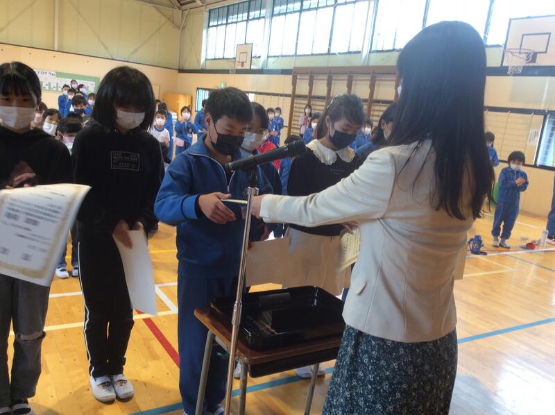 本日の八幡っこ集会の様子です。まず、6年生の体育大会の表彰を行いました。種目ごとに入賞者の名前が呼ばれると、代表児童は大きな声で返事をして、校長先生より賞状を受け取りました。返事も、賞状のもらい方も、大変立派でした。