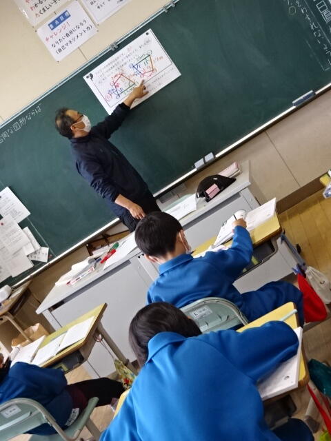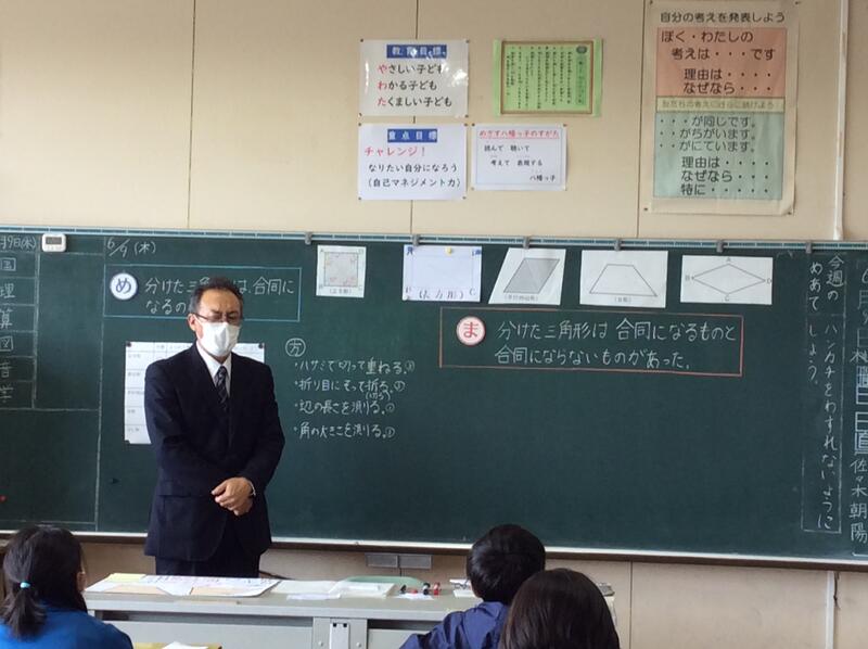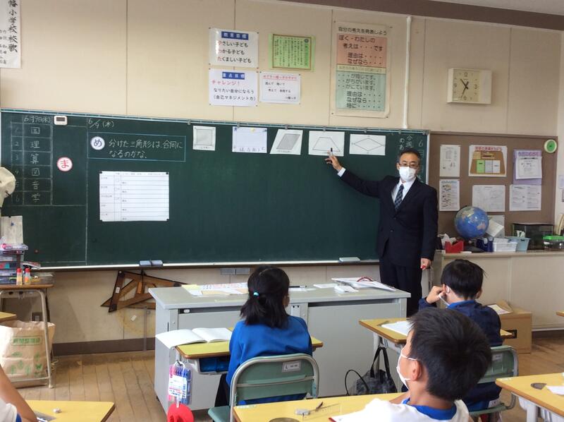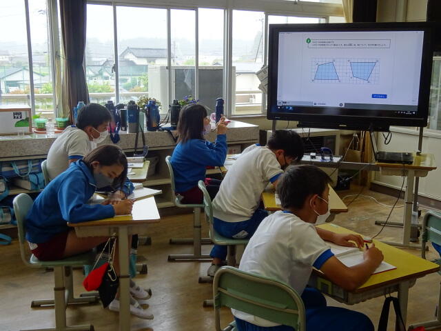 本日の5年生の算数の授業の様子です。四角形に1本の対角線をかいてできた2つの三角形が合同かどうかを調べる学習をしました。