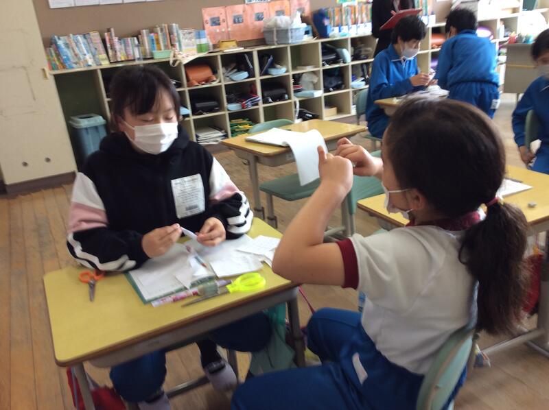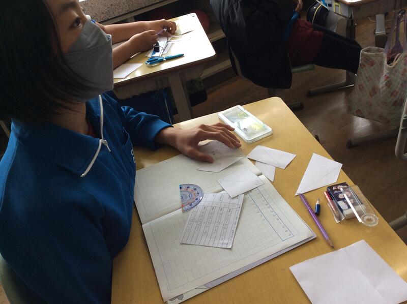 調べる方法は?はさみで切って重ねる、折って重ねる、角度を測るなどいろいろな方法が出ました。そして調べた結果をプリントにまとめて・・・ どうやって調べたか、調べた結果はどうだったか、その理由についてなどをペア学習になって、友達と伝え合うことができました。