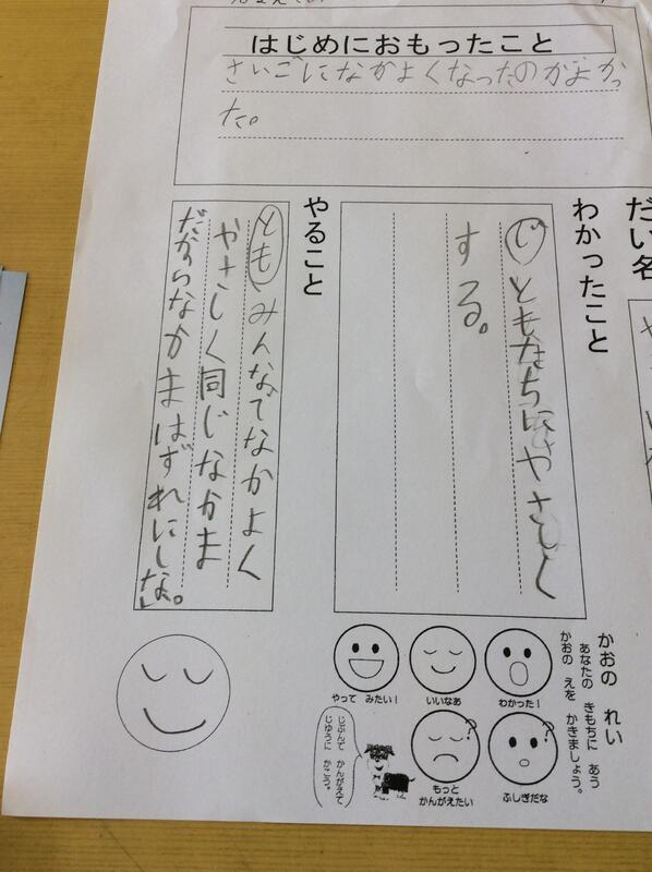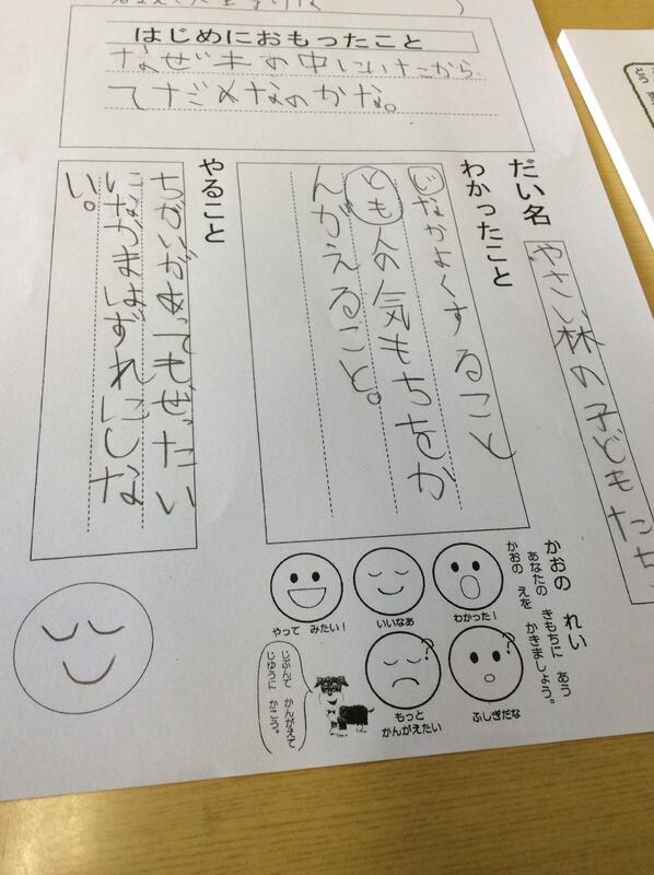 そして、最後に「ちがいがあっても同じ〇〇」の〇〇について考えました。ちがいがあっても同じ「なかま」だから仲間はずれにしない、人の気持ちを考えるなどの考えをワークシートにまとめていました。しっとりと考える2年生、すてきですね。