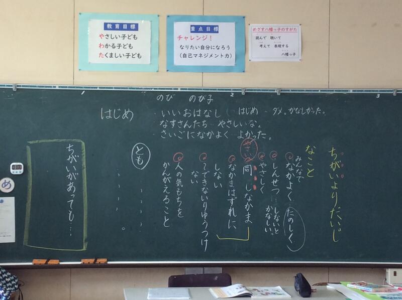 2年生の道徳の授業です。「やさい村の子どもたち」という資料を読んで、ちがいより大事なことについて考えました。