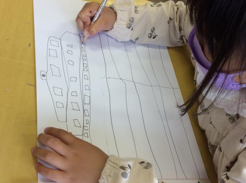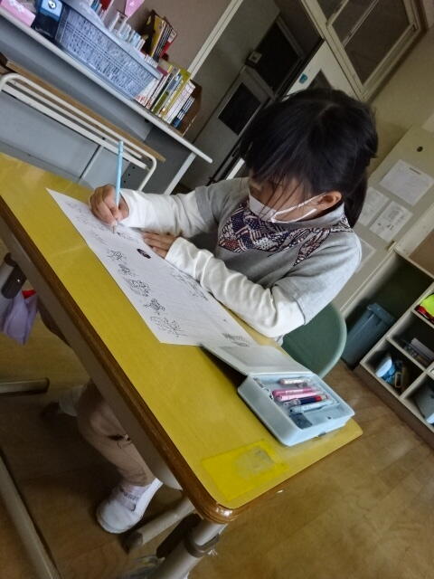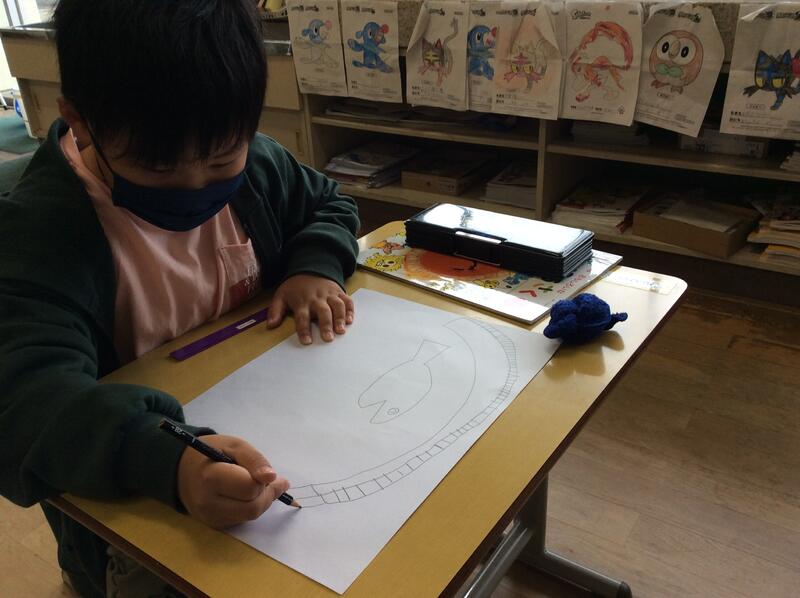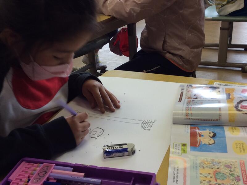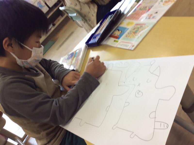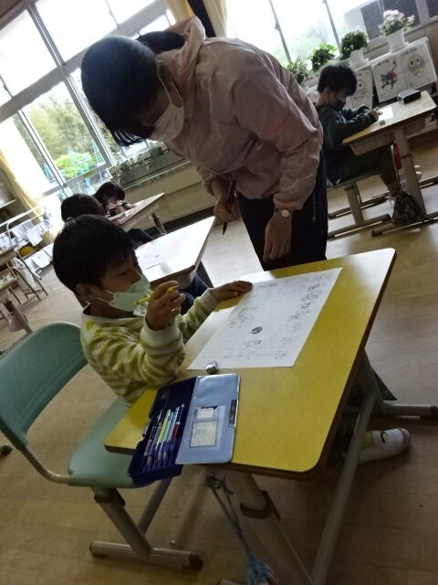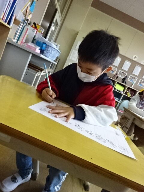 運動会で玉入れしたことや八幡小学校の校舎など、伝えたいことを思い出して、白い画用紙にのびのびと描いていました。次回は、クレヨンや絵の具で色を染める予定です。