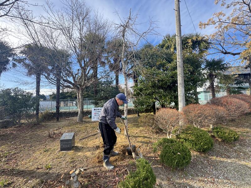 本日、青田様が来校され、校庭に植えてあるしだれ桜に肥料を追加していただきました。