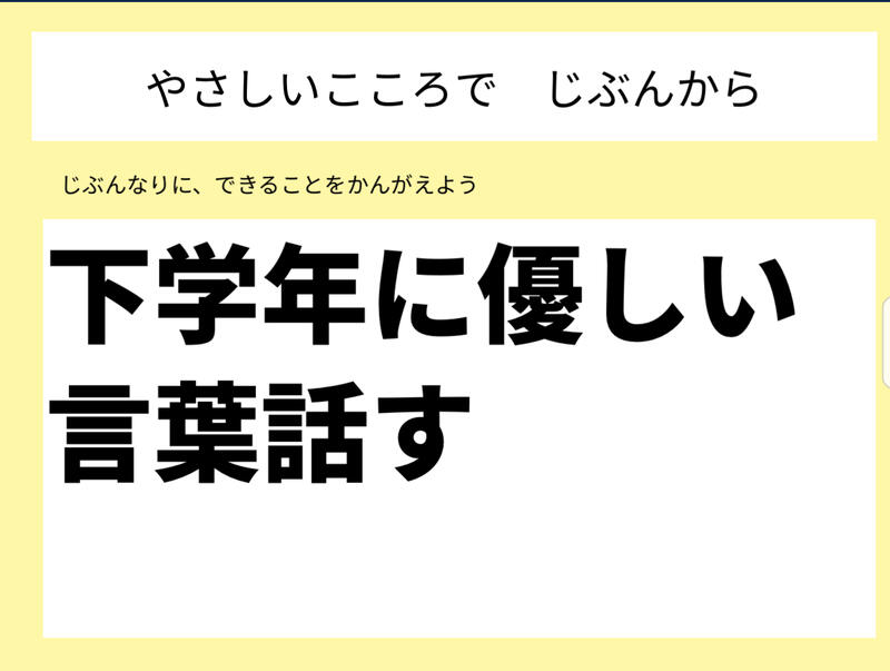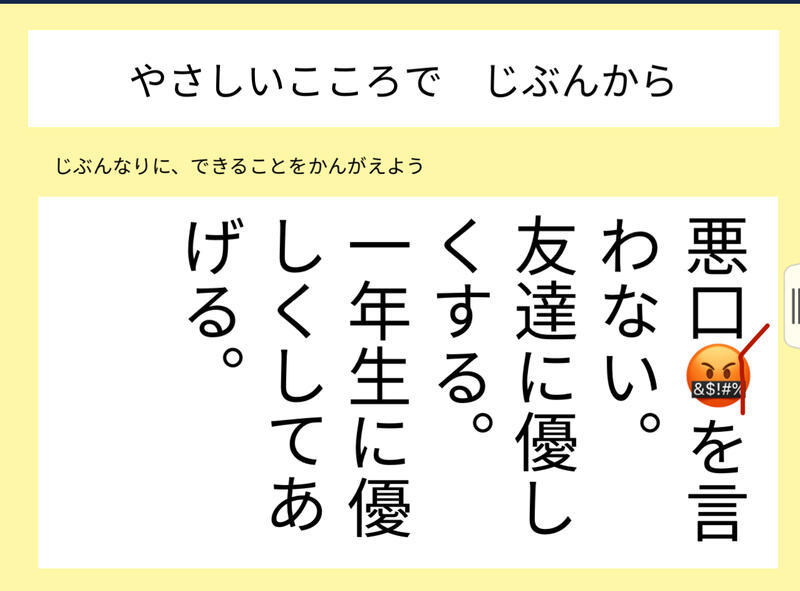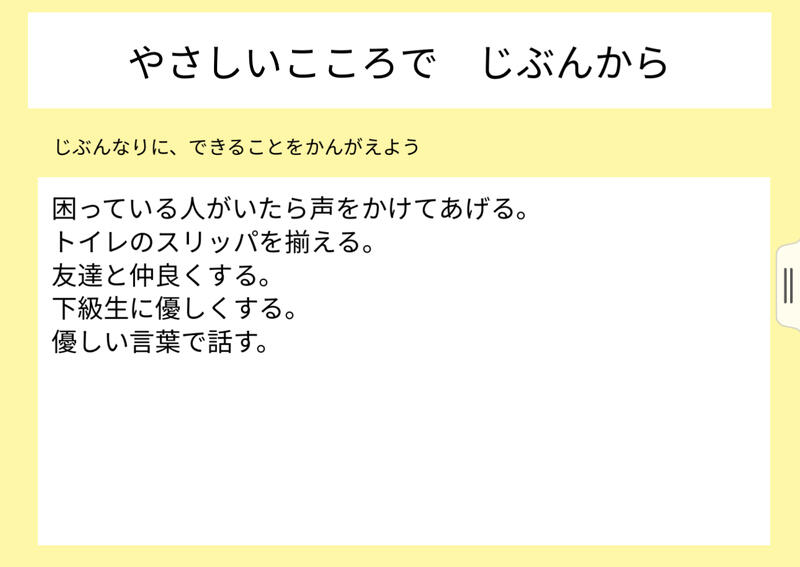 講話の最後に、「やさしい心で、自分から」の後に、何ができるかをロイロノートにまとめて、全校生で共有しました。