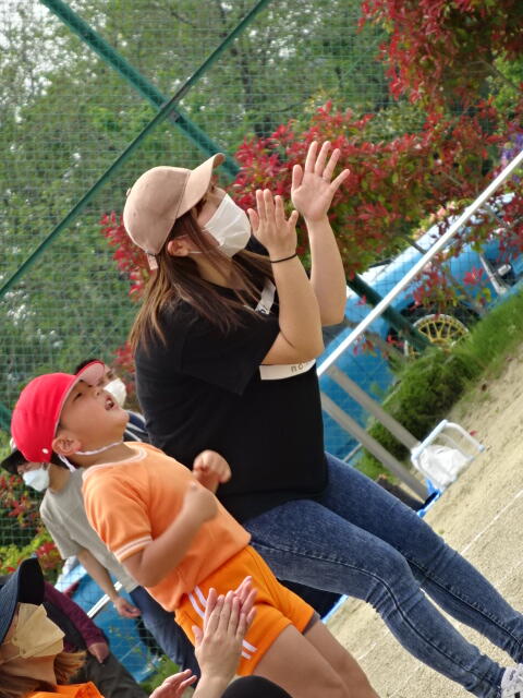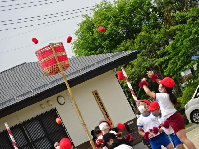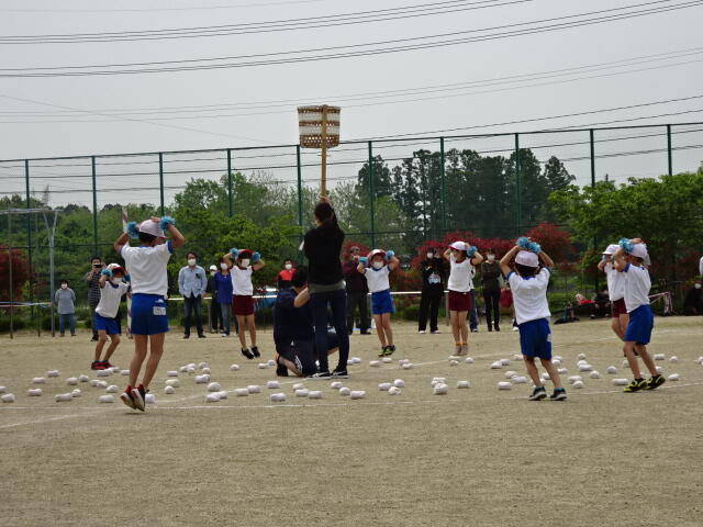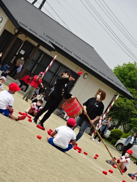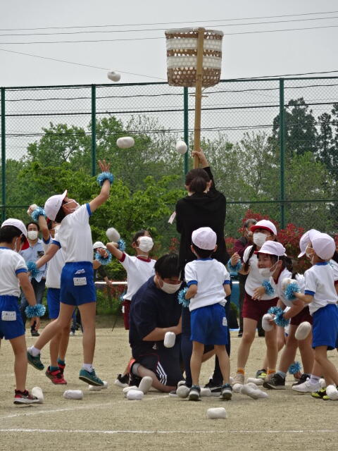 音楽に合わせて、チェッコリダンスを踊ったり、玉入れをしたりします。