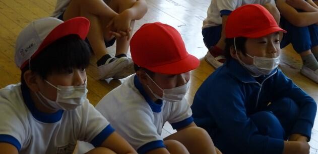運動会の種目「修行でござる!」の説明を真剣に聞く3年生。