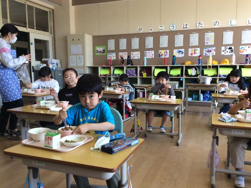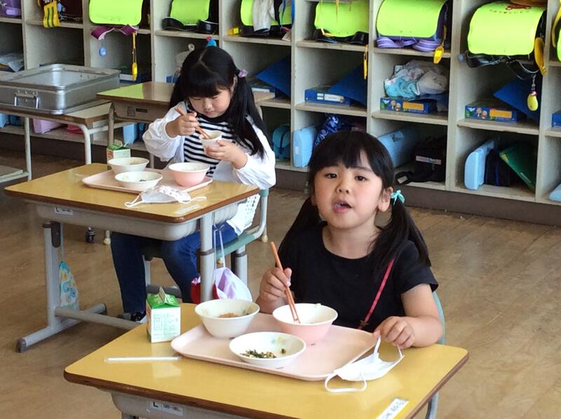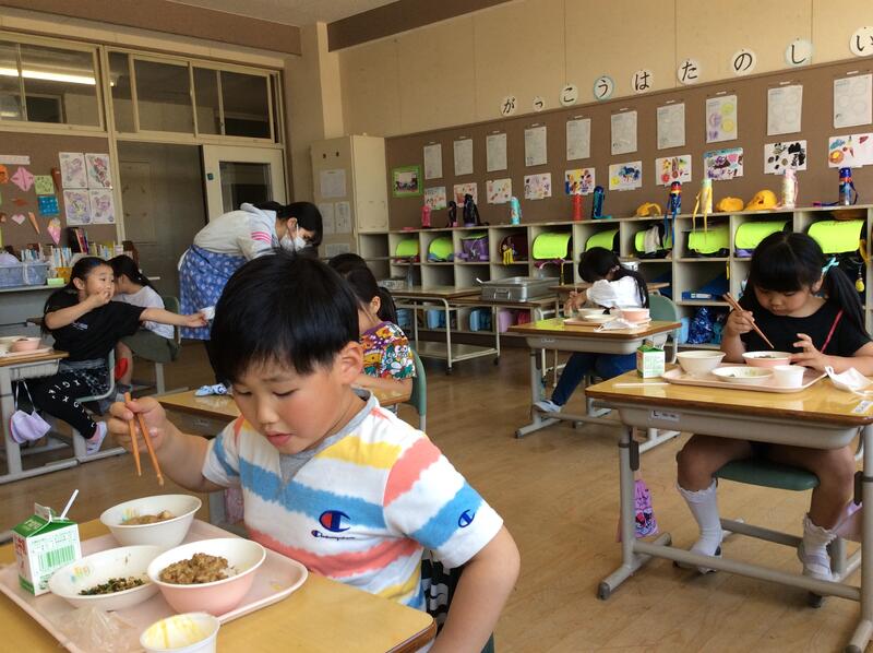 今日の給食は、五目納豆でした。1年生にとって、給食に納豆が出るのは初めてでしたが、上手に納豆をかき混ぜながら食べることができました。とてもおいしそうに食べていました。