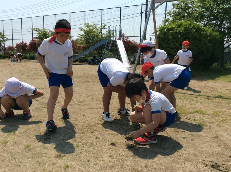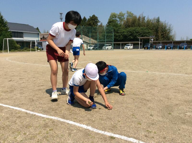 全体練習の後は、全校生で校庭の石ひろいや草むしりをしました。先日のPTA奉仕作業できれいに除草していただいた校庭ですが、さらにきれいになりました。集まった小石や草の後片付けは、ボランティア委員会のみなさんが、進んでしてくれました。