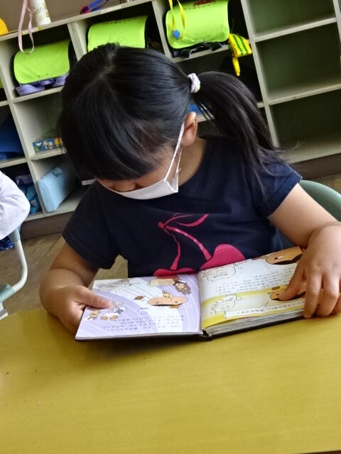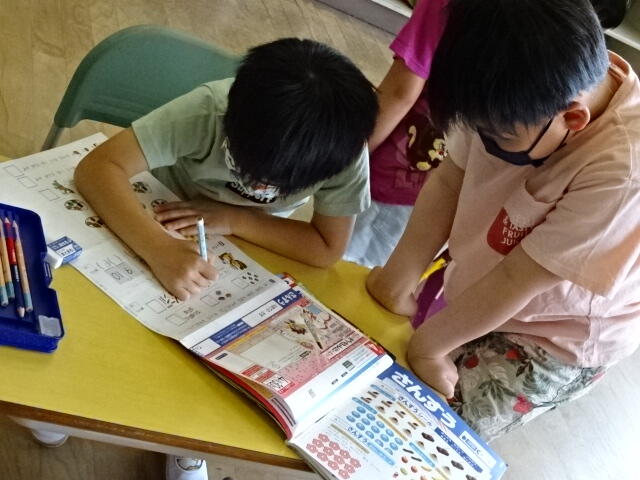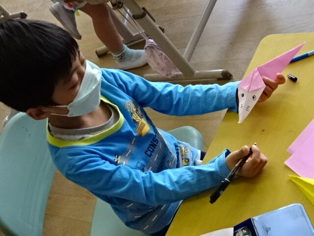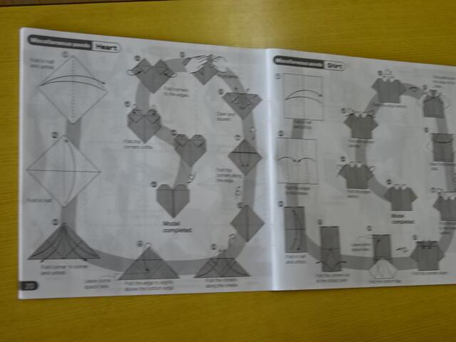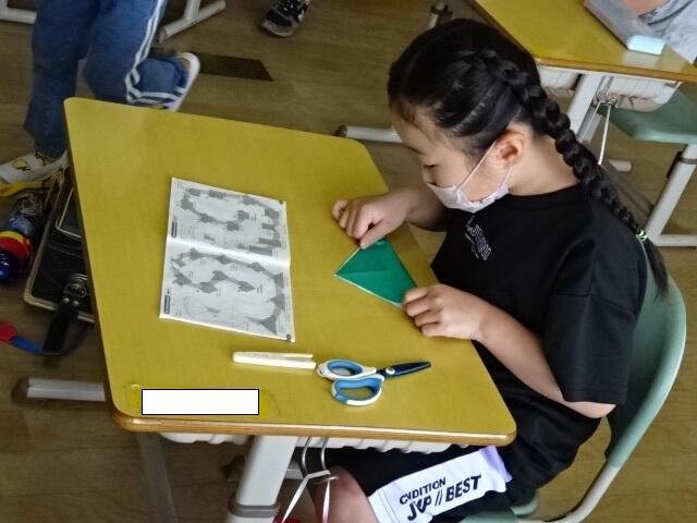 英語で書いてある折り紙の本の絵を見ながら、折り紙を折っている子もいます。