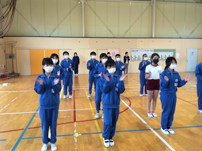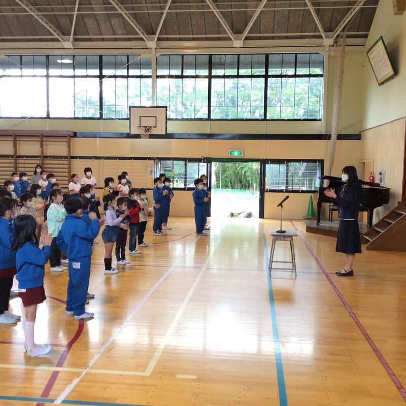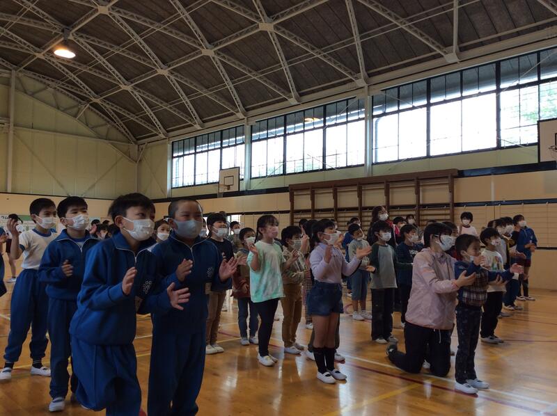 本日は、全校集会がありました。校長先生のお話では、全校生で「ボディーパーカッション」に挑戦しました。手拍子や足うちなどで、体を使って音を出す楽しさを味わいました。