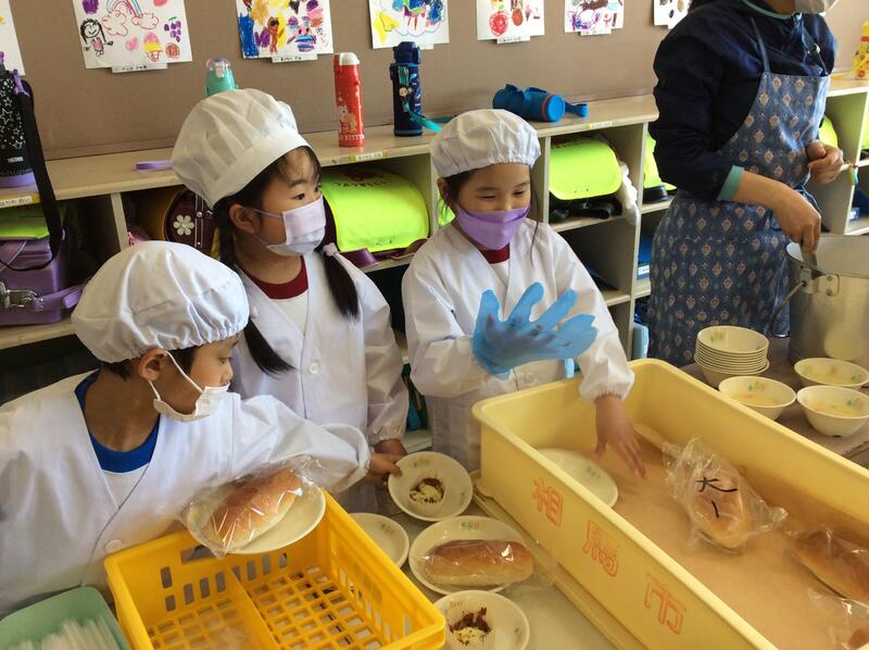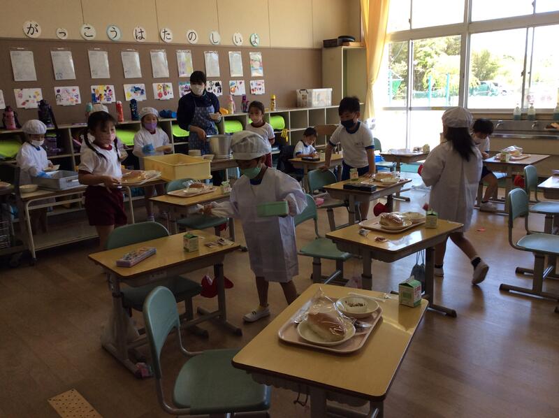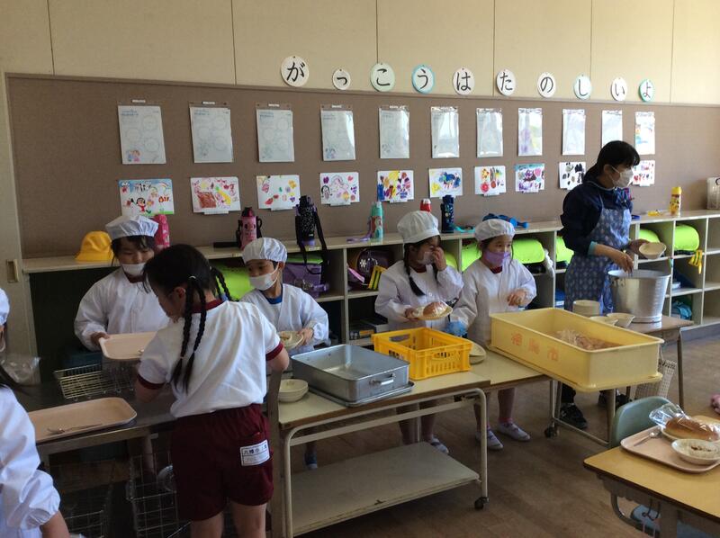 給食当番以外の1年生は、自分の分だけでなく、給食当番の友だちや先生の分まで給食を運んであげていました。とてもほほえましいですね。