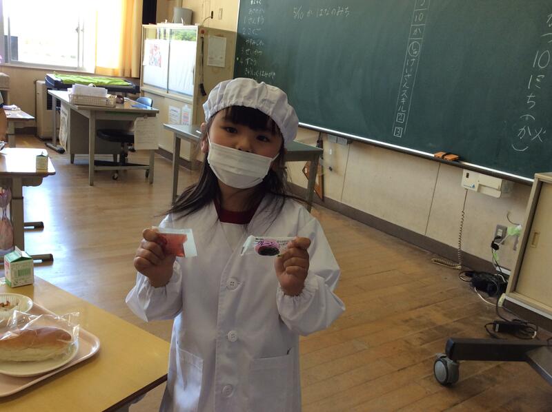1年生は、昨日の5月9日(月)から、本格的に給食当番をやるようになりました。初めての給食着に「かっこいい」の声。おぼん・おはし・おかず・ご飯(パン・麺)を配膳する人を決めて、担任の先生といっしょに上手に配膳することができました。