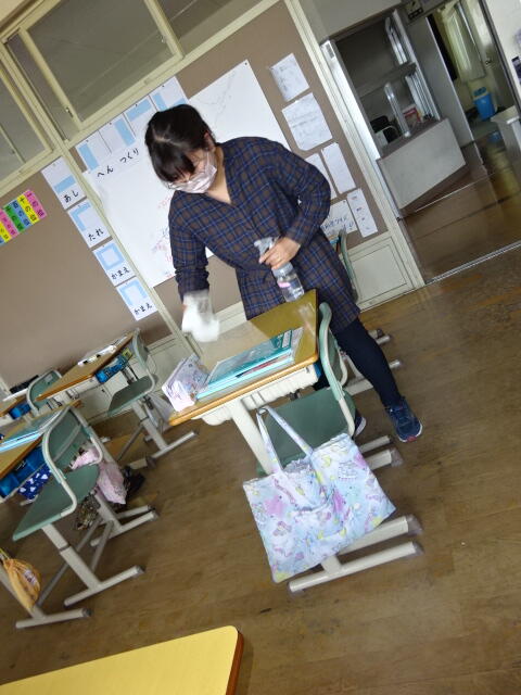 スクールサポートスタッフさんが教室を消毒してくれています。