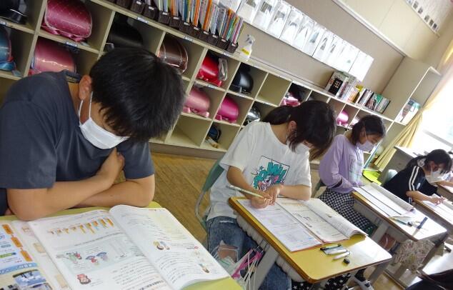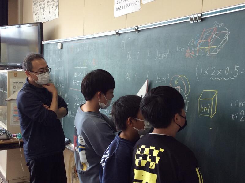 本日の5年生の算数の授業後の様子です。どのように考えたら体積を求められるかを、黒板に図をかきながら友だちに説明していました。熱心に伝えようとする気持ちが伝わってきますね。