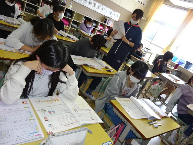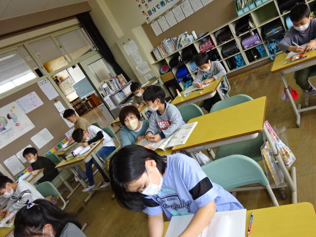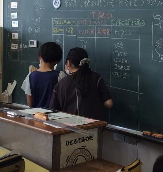 こちらは、6年生の家庭科の授業です。今日の給食の献立の食材を調べ、3つの食品群に分ける学習をしました。こちらも調べたことを黒板に書いて、みんなで確認しました。毎日の給食は、栄養バランスを考えて作られていることを実感することができました。献立を考えてくださっている栄養士さんやおいしい給食を作ってくださっている調理員さんに、感謝の気持ちを持ち続けたいですね。