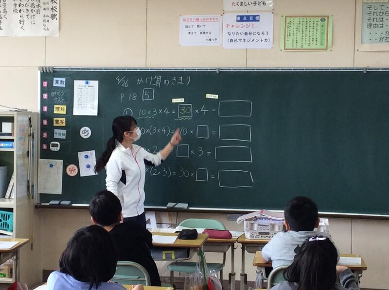 本日の3年生の算数の授業です。3つの数のかけ算の学習で、前から順にかけても、後の2つを先にかけても答えは同じになることを学びました。