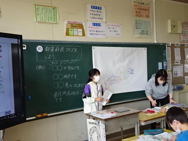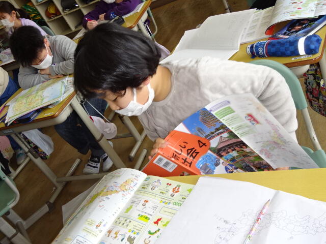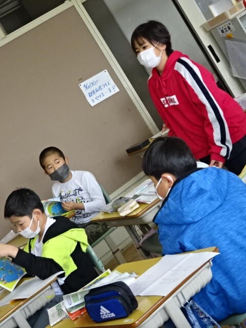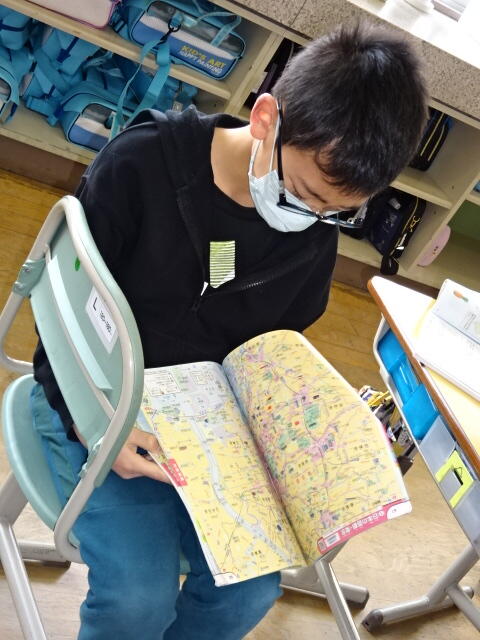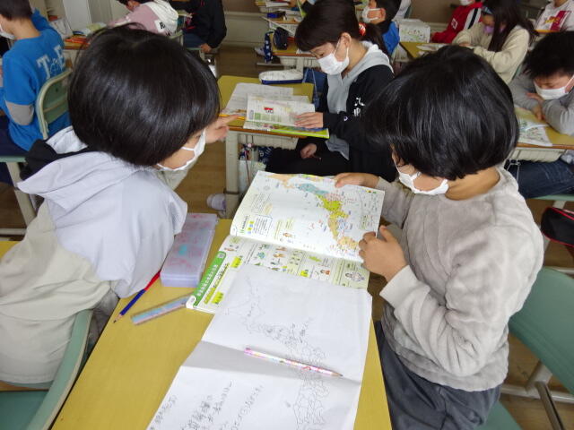 子どもたちは、友達どうしで相談したり、地図帳で確認したりしながらクイズを出し合いました。