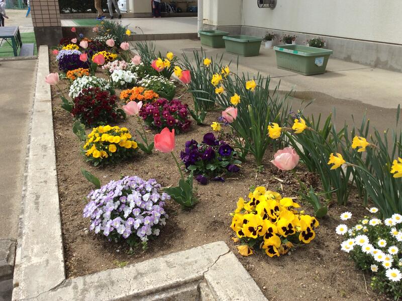 今日の休み時間は、晴れ間がのぞきました。校庭では、サッカーや鬼ごっこ、ブランコなどの遊具で、子どもたちは、楽しそうに遊んでいました。用務員さんが心をこめてお世話をしている花壇の花も、色鮮やかに咲いています。