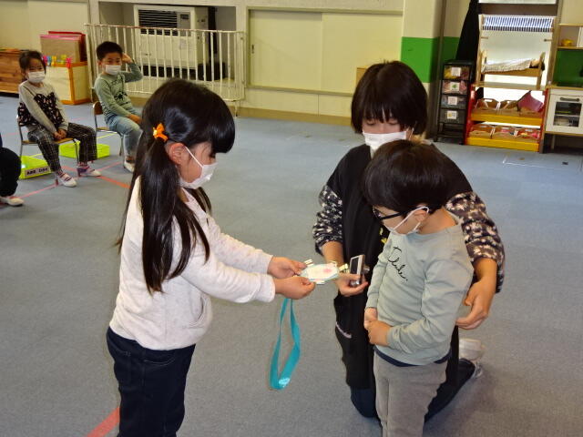 年長さんから年少さんへは、メダルのプレゼントがありました。