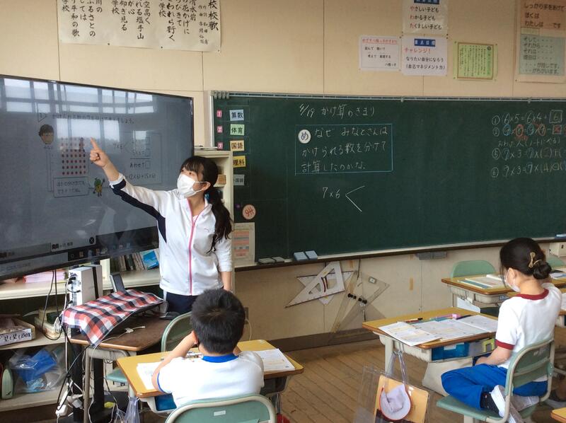こちらは、3年生の算数の授業の様子です。今日は、かけ算のきまりの学習です。大型モニターで図を使いながら、分配のきまりについて、みんなで考えました。