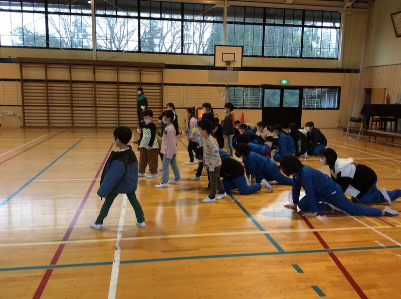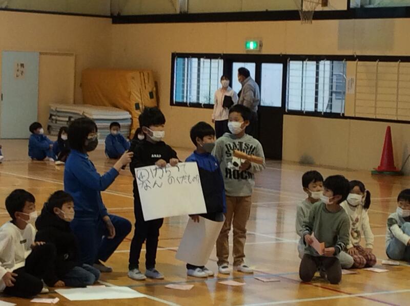 まず、6年生の発表です。6年生は、1年生といっしょに「だるまさんが転んだ」をしました。6年生は、四つんばいになって、1年生に有利になるようなルールを考えました。ナイスアイディアですね。