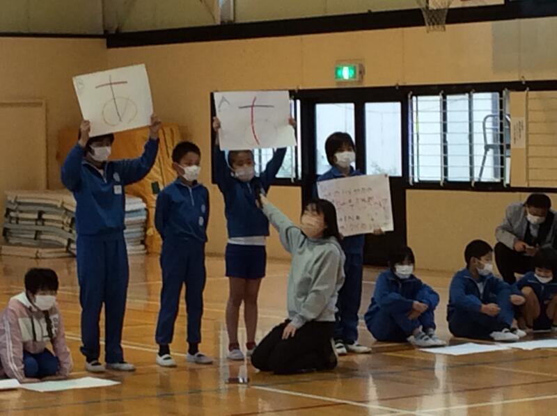 最後は、5年生です。5年生は、「〇✕クイズ」です。「保健室は、1年生の教室のとなりにある。〇か✕か?」など、1年生にとって分かりやすいクイズを出していました。さすが5年生です。