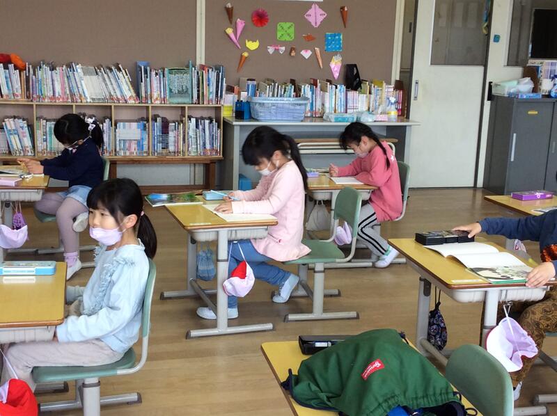 こちらは、1年生の教室の休み時間が終わった後の様子です。3校時目の国語の授業の準備を進んでしていました。「早くやりたいなあ」という声も。やる気まんまんの1年生です。
