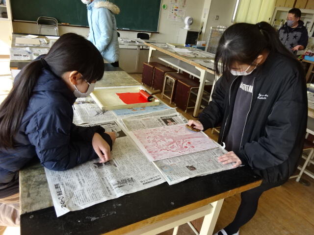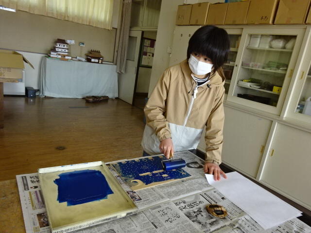 今日は、板を彫り終わった子どもたちは印刷をしました。