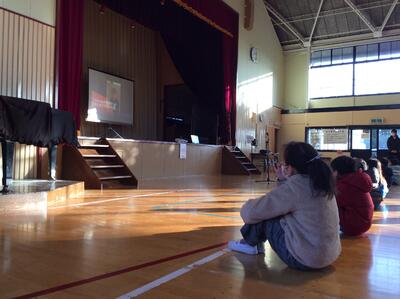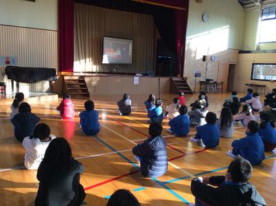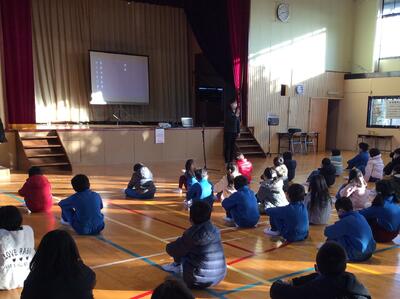 全校朝会の様子です。本日は保健委員会によるコロナウイルス感染予防のよびかけがありました。内容は主に次の3点です。