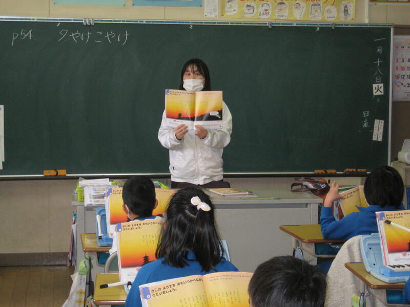 今日は「夕やけこやけ」の歌詞の様子を思い浮かべながら歌います。